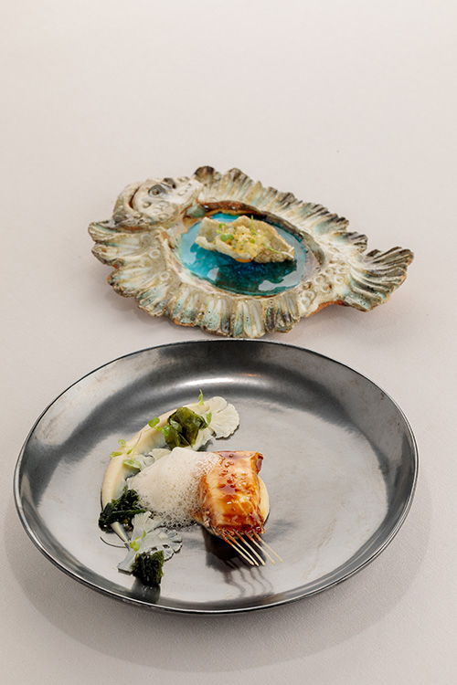 Two of the standout dishes on the lunch that show a strong connection to the Algarve are carabineiro(scarlet prawn) with flavours of Caldo Verde soup and an outstanding rendition of Algarve pork and clams. The current dinner menu is themed on the ocean and is presented at the table like a message in a bottle. One of the most impressive dishes, served as a transition between the fish and meat courses, is one that tricks the palate; a rack of sole is served to resemble a tiny rack of meat on the paired bones with a pork belly demi-glace, a foam flavoured with smoked pork, textures of cauliflower and pickled seaweed.